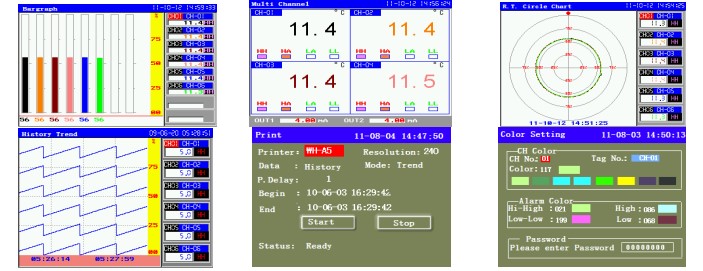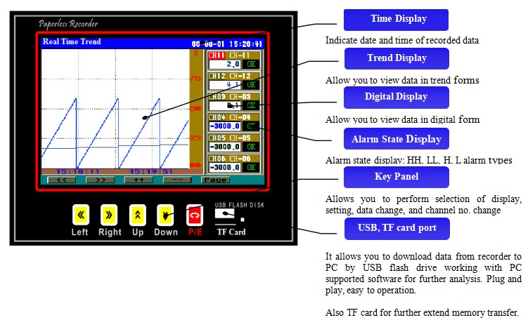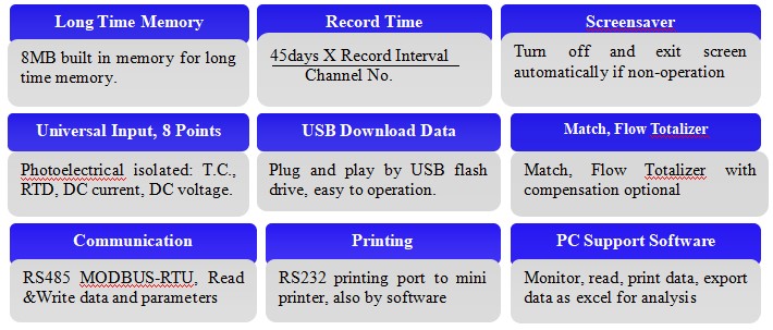 KH800G color paperless recorder (1195x145x60.5mm, up to 8 channels ) is color TFT LCD display; completely isolated universal input such as thermocouple, thermal resistance, current and voltage, frequency input, can support multi-loop flow totalizer with automatic temperature and pressure compensation function; adopts modular structure output functions such as alarm, auxiliary power supply for sensors output, retransmission, print and communication etc. Measuring data can be displayed in various types, such as graphic display as bar-graph, real-time trending, history trending memory, real time circular chart, history circular chart memory and alarming state display. also can be printed in curve and data by mini printer through RS232 port ; At the same time, it also provides features to check the data’s of year, month, day, hour, minute, second directly. Recorder can be configuration with OPC server, SCADA system and other professional software with MODBUS-RTU communication protocol through RS485 port. The history data can be downloaded directly by USB flash drive, plug and play, easy and flexible. PC supported data analysis software can print the data in curve and output Excel format for further analysis..