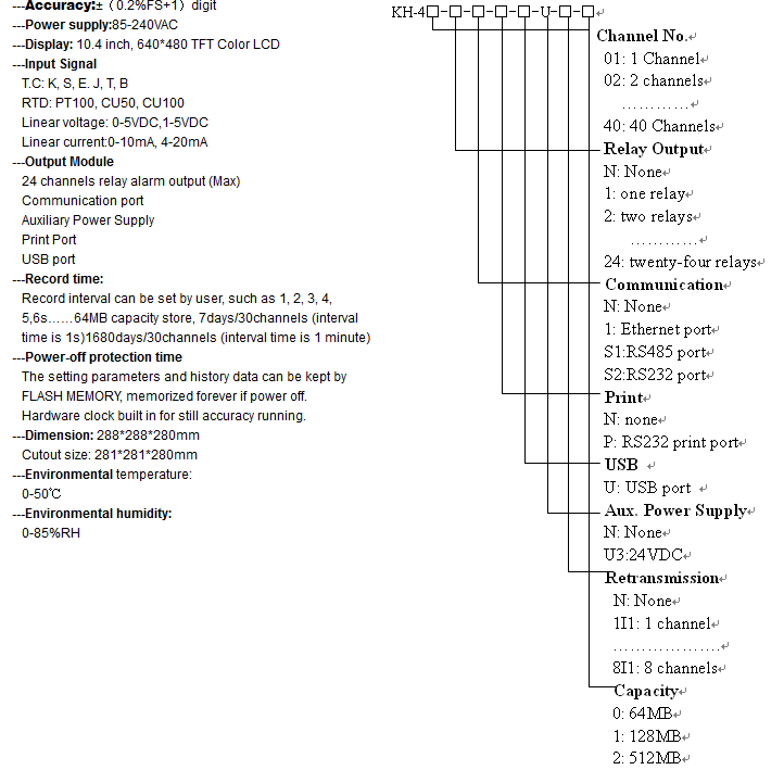 E.g. Order Code: KH440B-D-24-S1-U3-S1-N, model: KH200B-D, 160X80x105mm, 16 Channels, 8relay alarm output, USB port, RS485 communication port,24VDC aux. output, 220VAC power supply